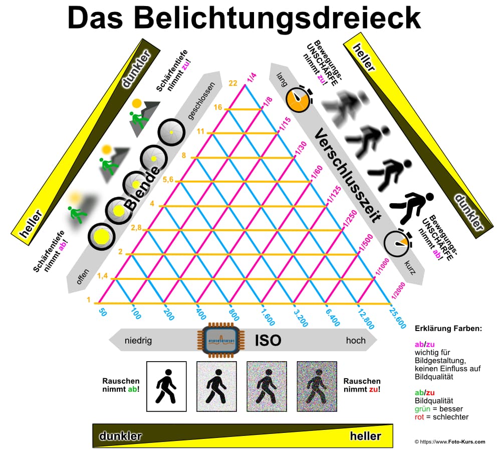 Die Helligkeit und Schärfe des Bildes werden durch Blende, Verschlusszeit und ISO gesteuert.